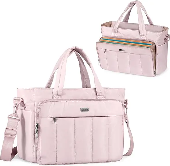 The LUXJA Puffer Tote Bag is a lightweight yet spacious option designed for school, work, and everyday use. It features a built-in laptop sleeve and an accordion-style file pocket to keep documents and devices organized and protected. The padded, puffy design offers comfort while adding extra cushioning for your belongings. Stylish and practical, this tote is ideal for carrying essentials without feeling bulky