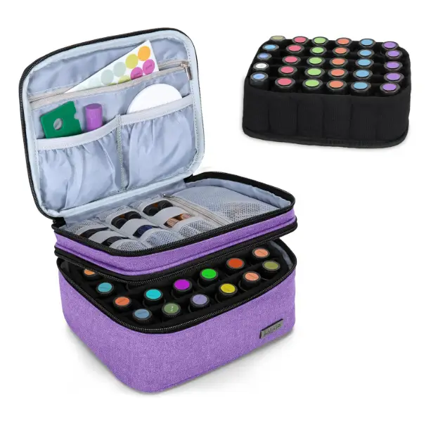 The LUXJA Essential Oil Carrying Case is designed to safely store and organize up to 30 essential oil bottles ranging from 5 ml to 30 ml, including roller bottles. Its double-layer design keeps bottles upright and separated, helping prevent leaks and breakage while making labels easy to read. The top compartment provides space for droppers, caps, and other accessories so everything stays in one place. Lightweight yet protective in a stylish purple finish, this case is ideal for home storage or travel