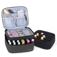 The LUXJA Nail Polish Carrying Case is designed to securely store and transport up to 20 standard 15 ml nail polish bottles. Individual padded slots keep bottles upright and protected, helping prevent leaks, breakage, and color mixing during travel or storage. Extra space allows you to organize manicure tools and accessories in one convenient place. Compact, sturdy, and easy to carry, this black organizer is ideal for nail technicians or anyone with a growing polish collection